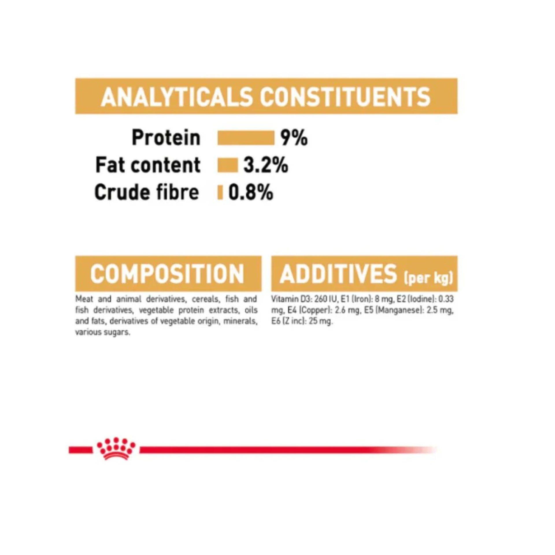 Feed 2 to 3 pouches per day depending on the cat’s weight and activity level. Can be served alone or mixed with Royal Canin British Shorthair Dry Food. Always provide fresh water.