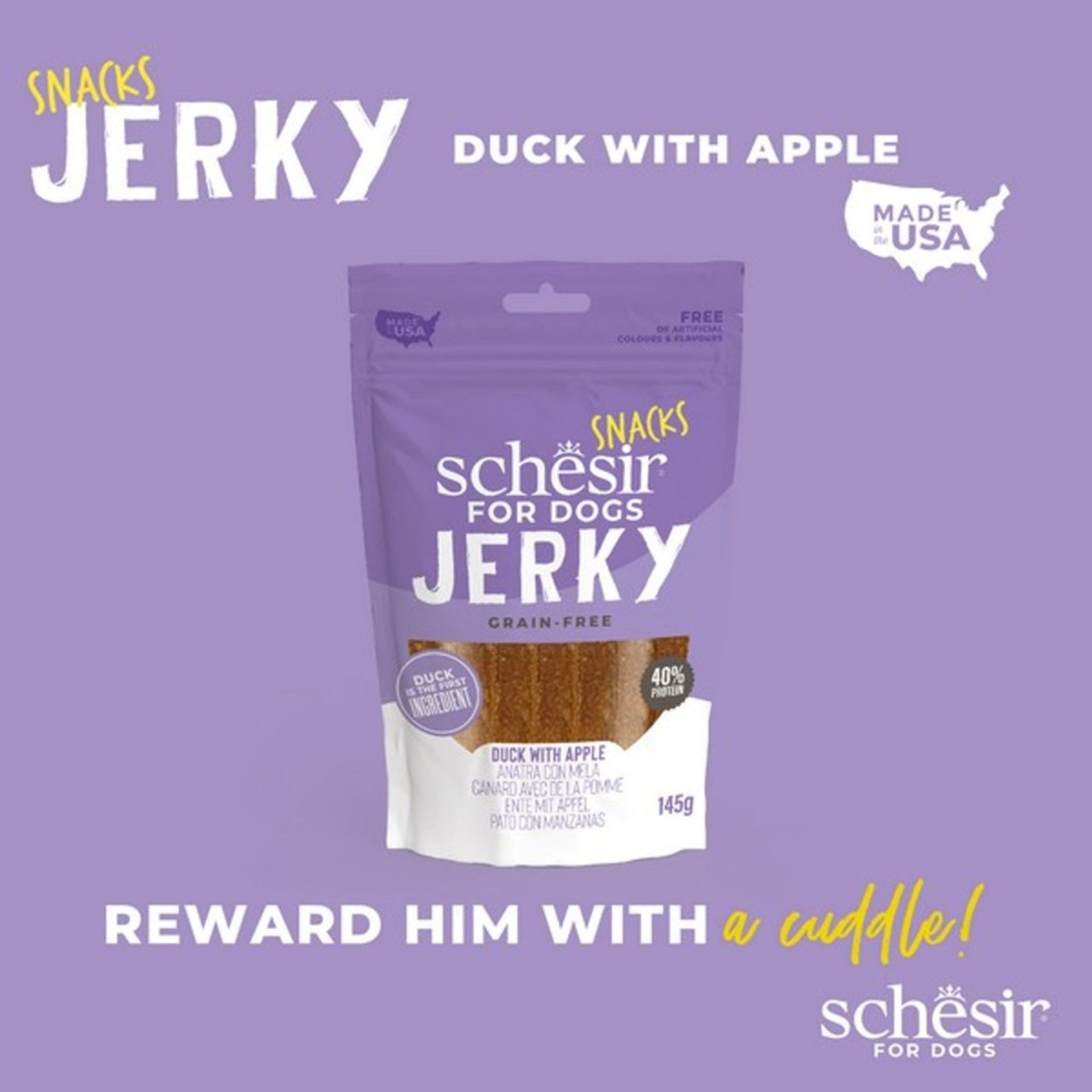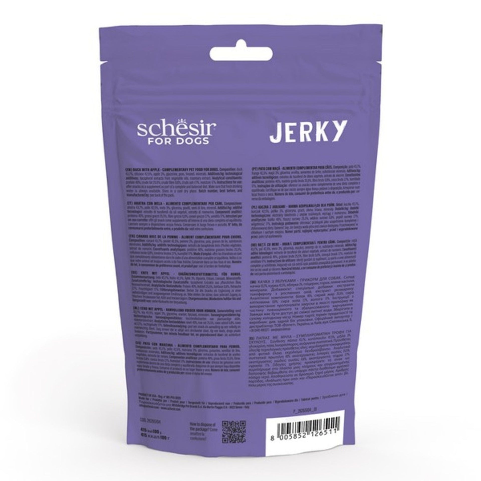 Schesir Duck & Apple Jerky offers a naturally flavourful, grain-free treat made with real duck breast and apple slices. Gently air-dried to preserve nutrition and aroma, these soft jerky strips are rich in protein and fibre, making them a wholesome choice for daily rewards or training. With no added grains, artificial colours, or preservatives, it’s a simple treat dogs love and owners trust.