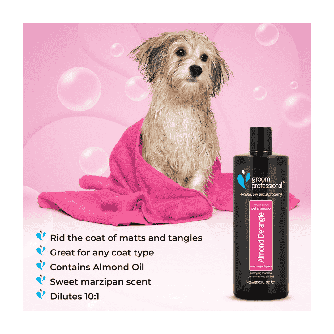 Almond Detangle shampoo is designed for gentle cleansing on long-coated and non-shedding dog breeds, which may be prone to knots and matting and will really speed up grooming time in the salon. Detangle Shampoo is formulated with Almond oil, which helps to ease out knots when bathing and leaves the coat in great condition. Coat Type – medium-long, tangled coat. Concentrated 10:1 dilution rate.