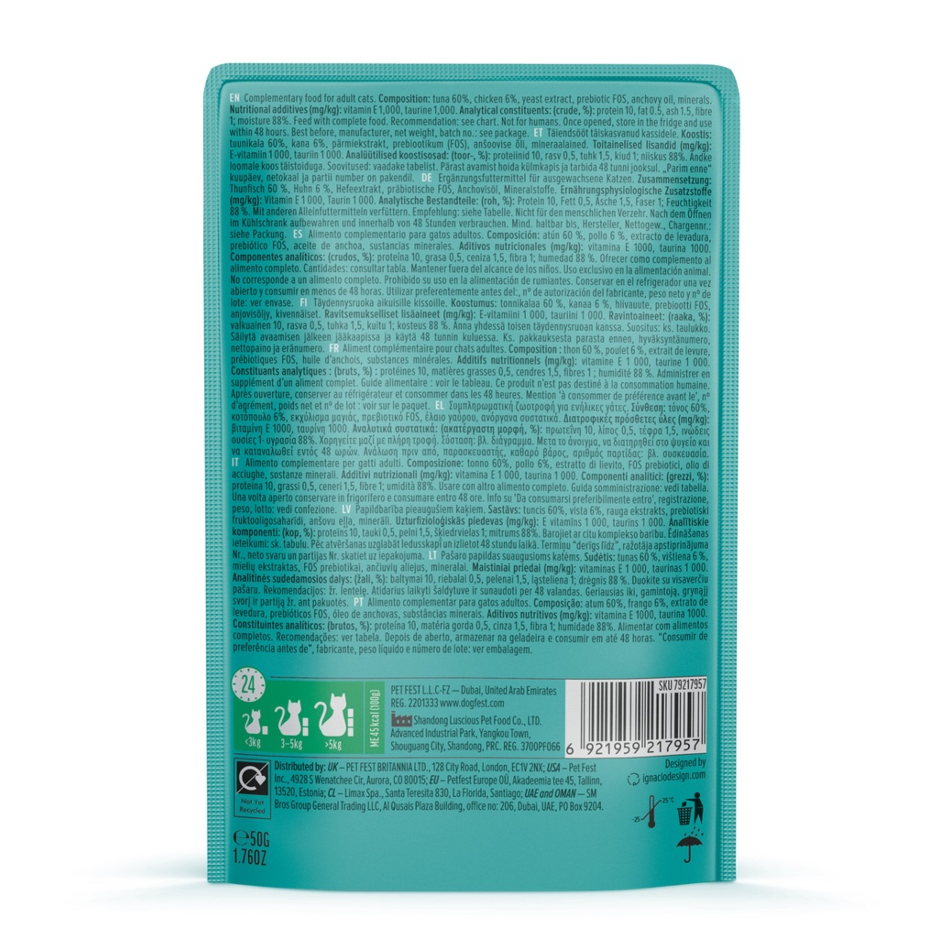 Tuna 60%, chicken 6%,yeast extract, prebiotic FOS, anchovy