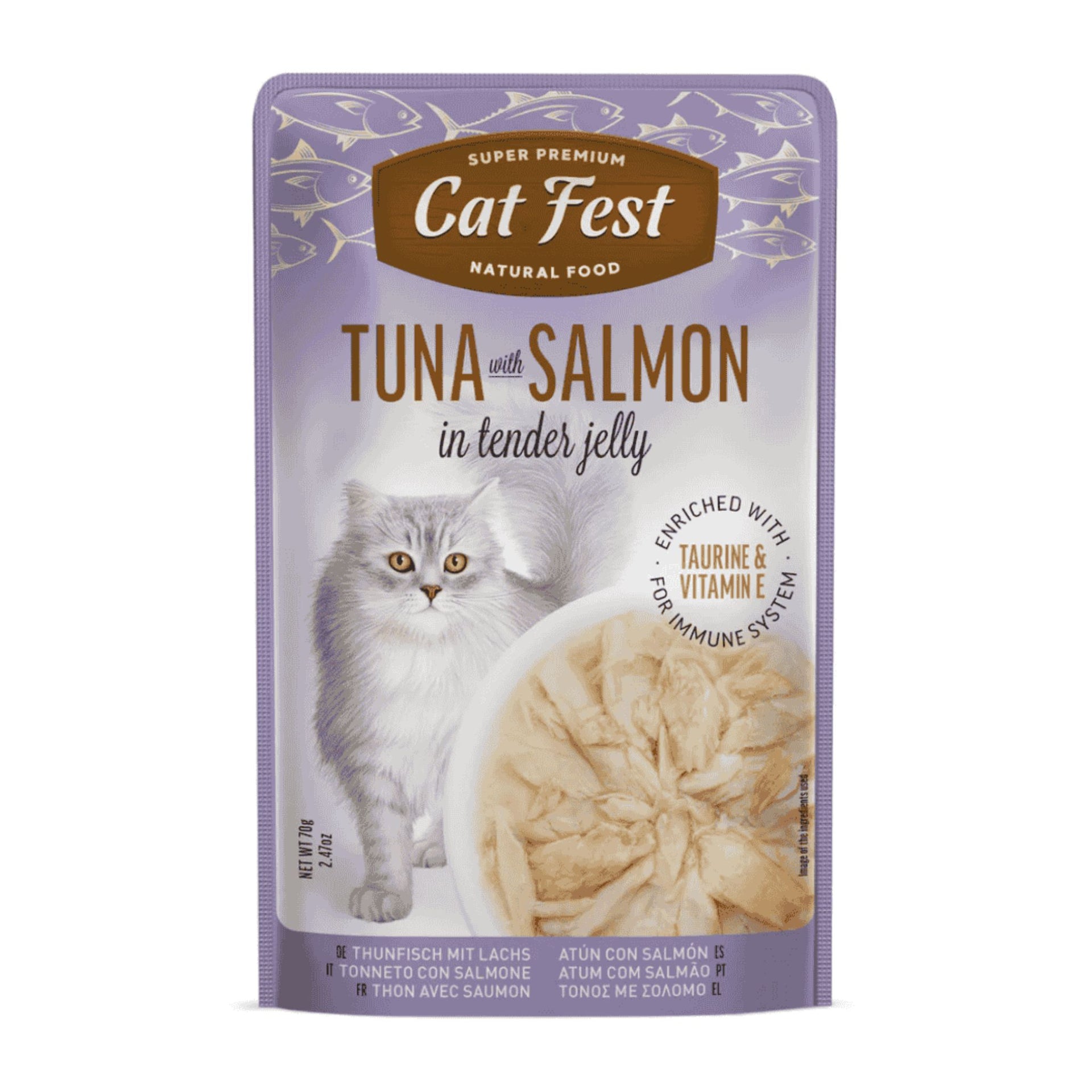 Treat your cat to the perfect combination of ocean and river flavors with Cat Fest Tuna with Salmon in Tender Jelly. This super-premium wet food blends real tuna and succulent salmon in a delicate jelly that locks in flavor, moisture, and nutrients.