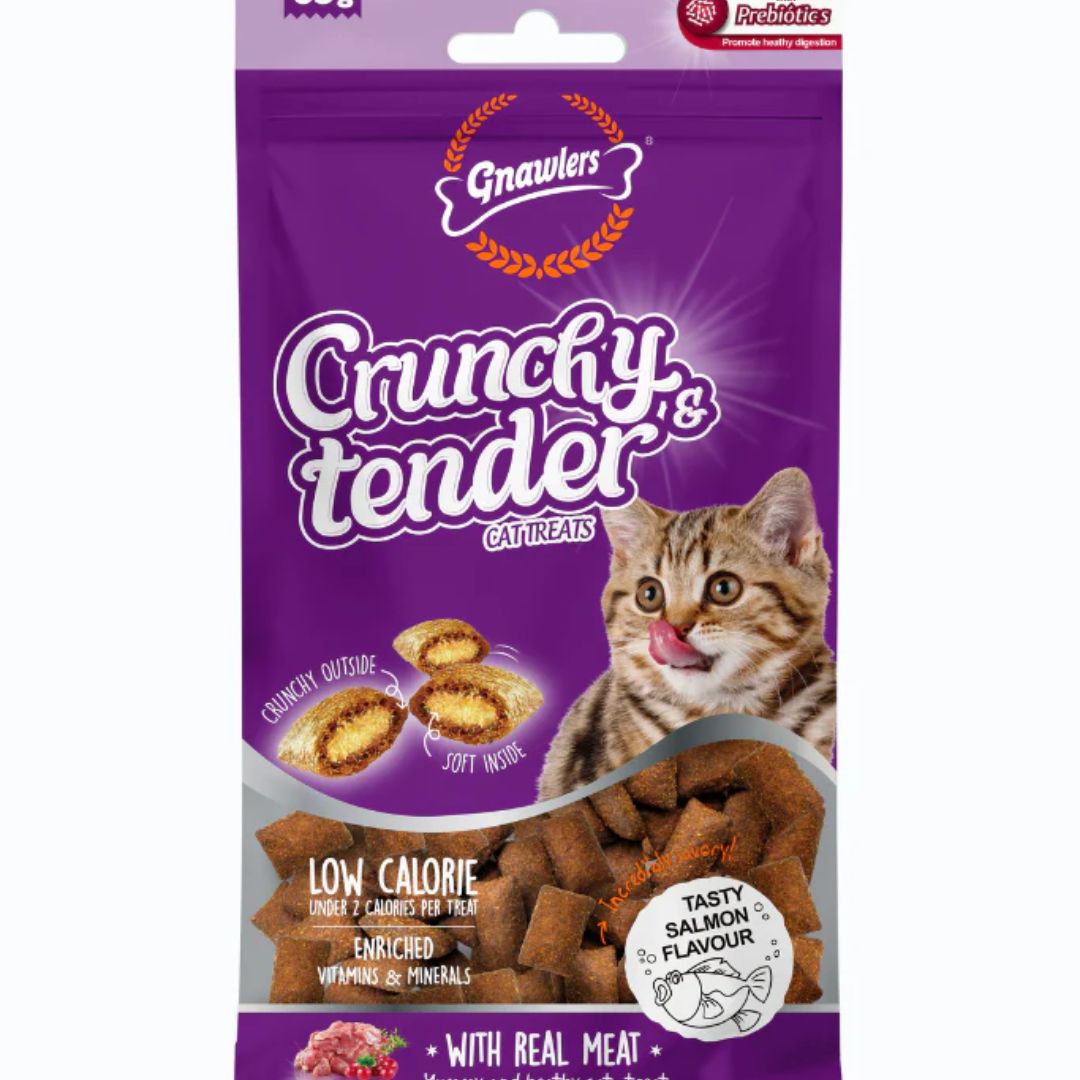 Spoil your cat with the delicious taste and exciting texture of Gnawlers Crunchy & Tender Cat Treats in rich salmon flavor. Each treat features a crispy outer shell that helps clean teeth and a soft, flavorful filling packed with salmon goodness. Enriched with taurine, vitamins, and minerals, these treats are as healthy as they are tasty, making them perfect for daily indulgence.