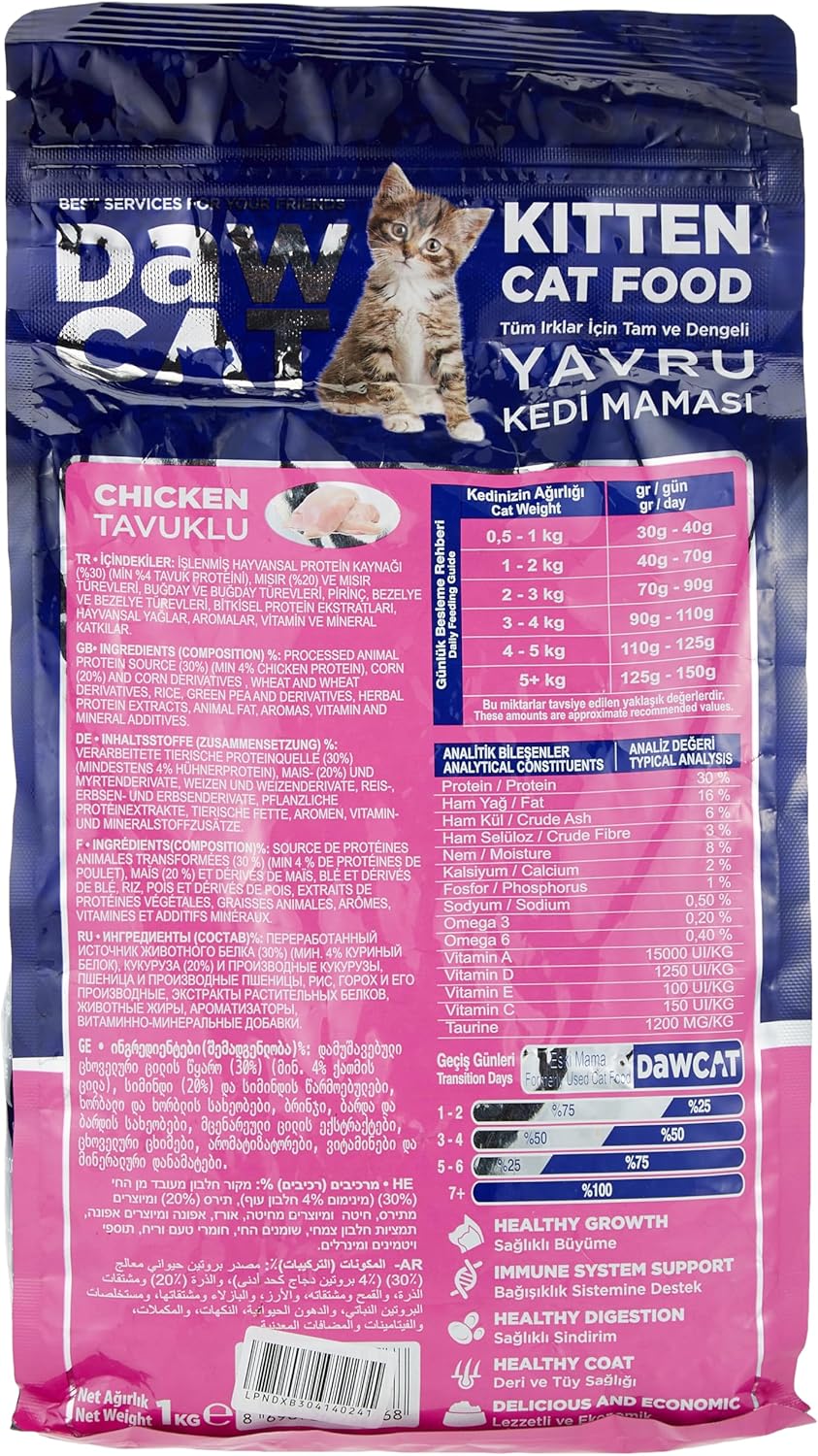 Support your kitten’s healthy development with Dawcat Kitten Cat Food – Chicken, a specially formulated diet made with high-quality ingredients to meet the nutritional needs of kittens during their crucial growth phase. This protein-rich meal features tender chicken and essential nutrients to promote strong muscles, bone growth, and overall wellbeing.