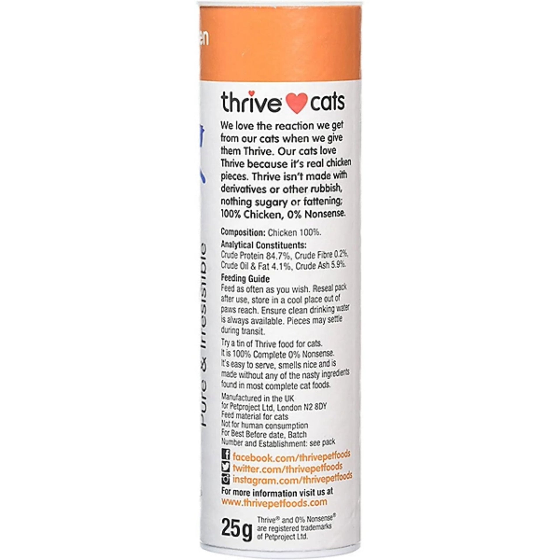 Thrive cat treat packaging shown next to a hand for size reference on a white background