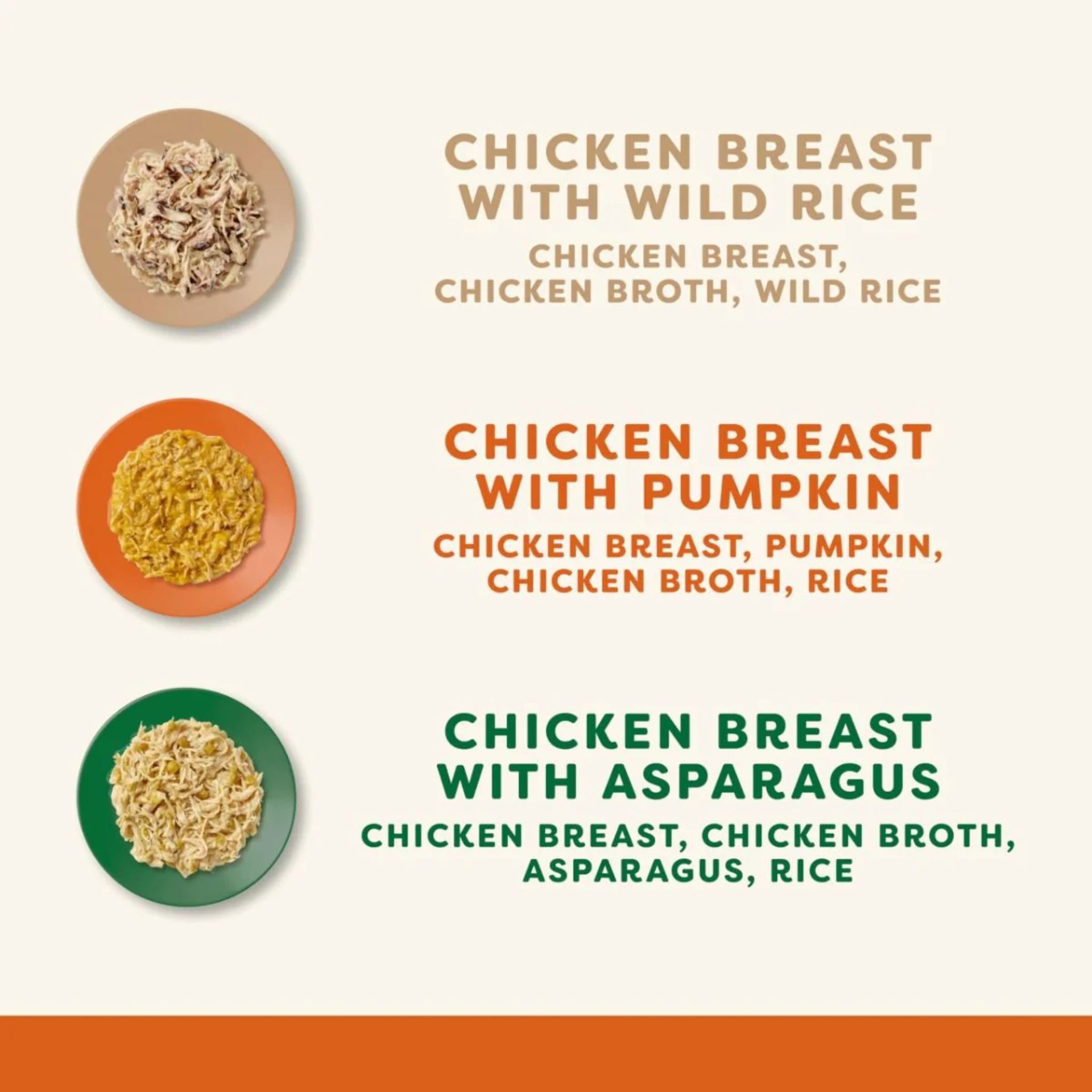 Chicken Breast with Pumpkin: Chicken Breast 50%, Pumpkin 25%, Chicken Broth, Rice.