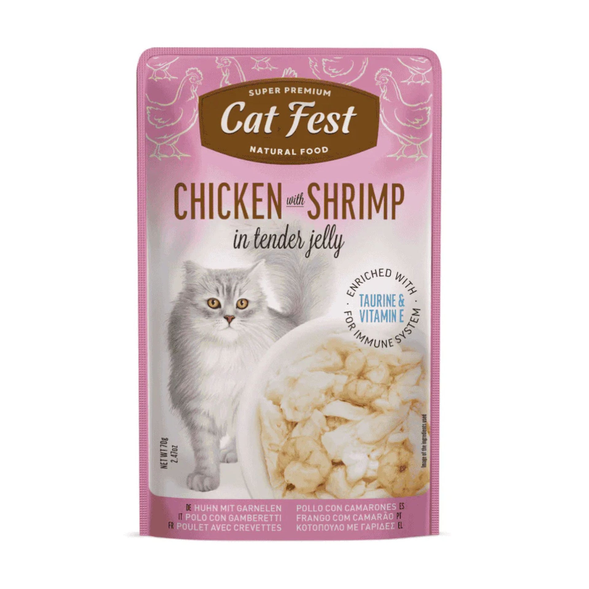 Give your feline a 5-star meal with Cat Fest Chicken & Shrimp in Tender Jelly – where taste meets nutrition in every pouch.