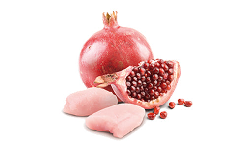 Chicken (70%), water for processing, pomegranate (5%), herring oil, dried sweet orange peel, aloe vera extract, green tea extract, glucosamine, chondroitin sulfate, vitamins, and minerals.