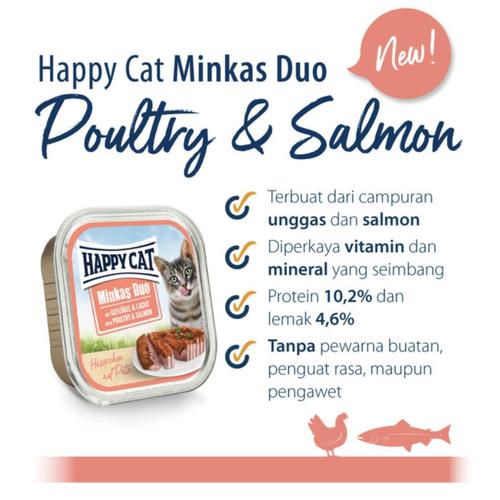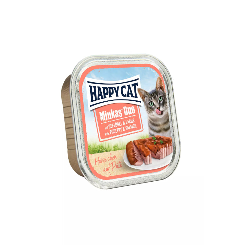 A delicious dual-layered wet food crafted with quality poultry and salmon to provide both taste and nutrition. The Minkas Duo range features a hearty pâté topped with tender meat pieces in sauce—ideal for adult cats who enjoy variety in texture.