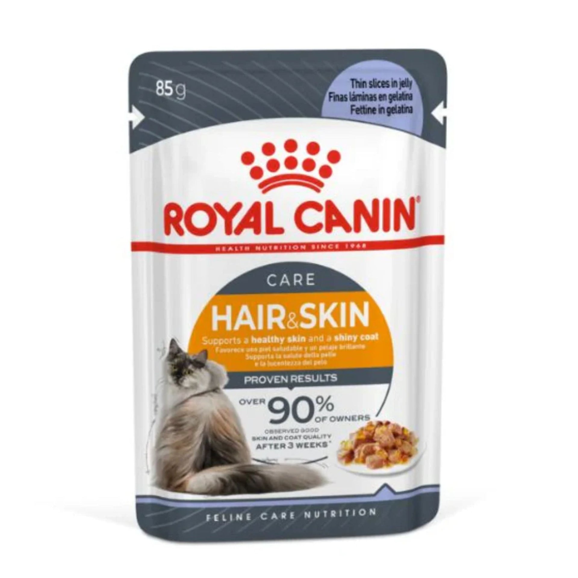 Royal Canin Hair and Skin Care in Jelly is formulated to support healthy skin and a shiny coat. Ideal for cats with a dull coat or dry skin, this recipe helps improve coat condition and skin health in just a few weeks.