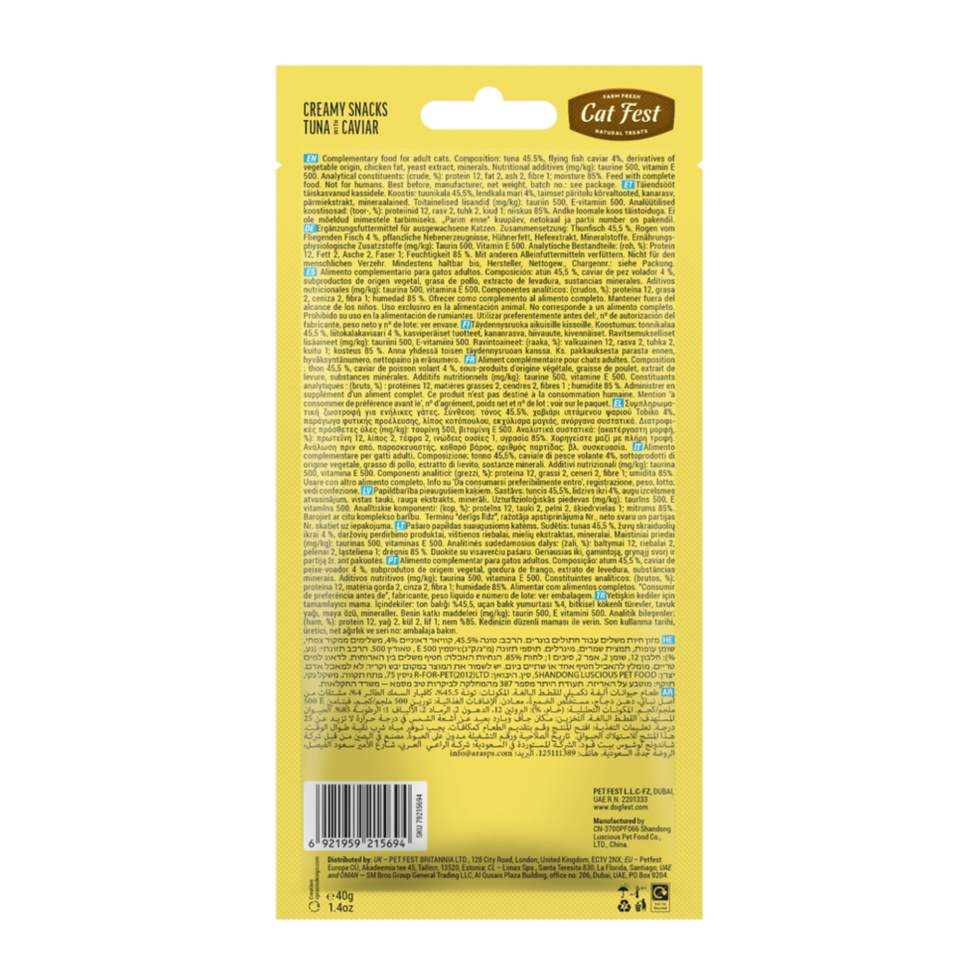 Tuna 45.5%, water 42,55%, flying fish caviar 4%, wheat protein hydrolysate, potato starch, chicken oil, yeast extract, salt, vitamin E, Nutritional additive: taurine 500 mg/kg.. technological additive: guar gum 12000 mg/kg