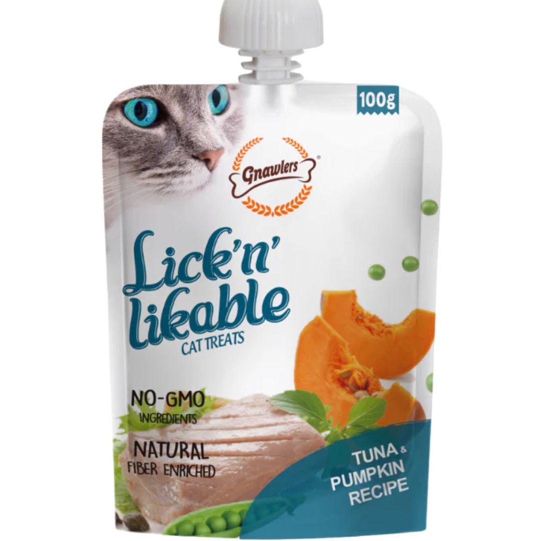 Give your cat a wholesome and flavorful treat with Gnawlers Lick N Lickable Cat Treats in a nutritious tuna and pumpkin recipe. Made with real tuna for high-quality protein and fiber-rich pumpkin for digestive health, this creamy lickable treat is enriched with taurine and essential nutrients to keep your cat happy and healthy. Perfect for hand-feeding, topping meals, or rewarding good behavior, it’s a delicious way to bond with your feline friend.