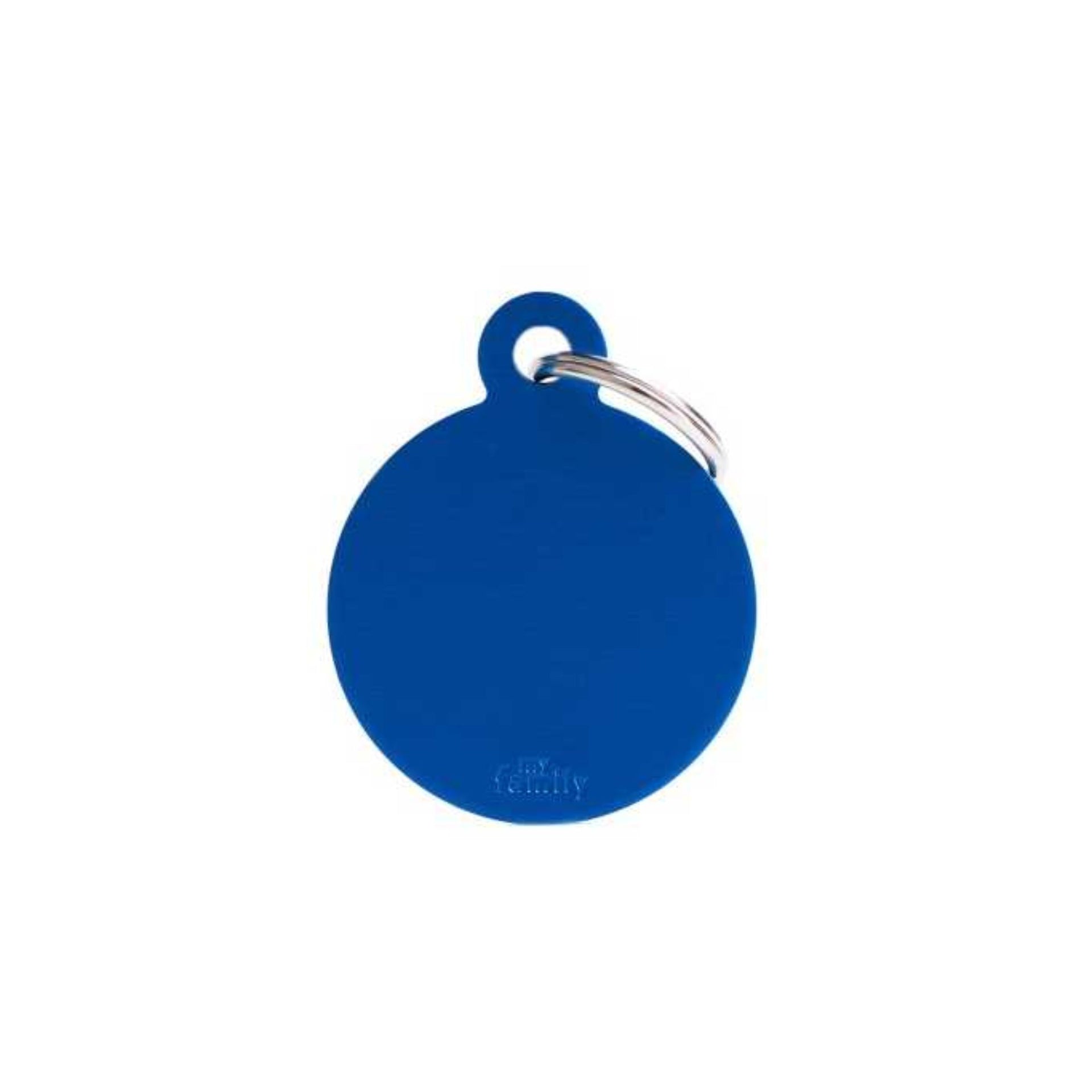 My Family Large Black Aluminum Circle Pet ID Tag is a lightweight and durable identification solution designed for pets that need clear visible details. The large round shape offers ample space for engraving important contact information. Made with a black aluminum body and available in light blue dark blue red and purple color options this tag adds both safety and style to your pets collar.