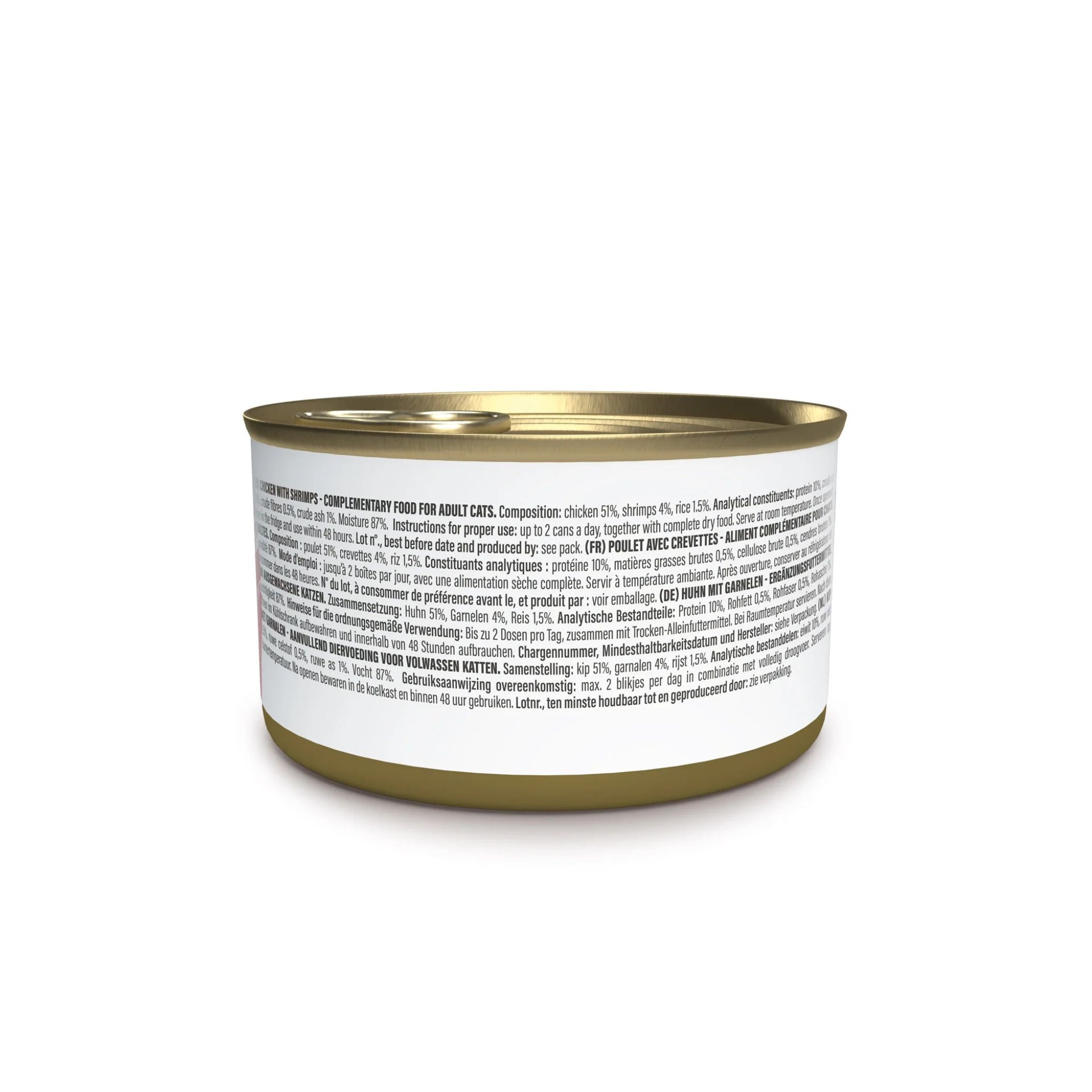 Chicken fillet (min. 45%), shrimp (min. 6%), rice (1.5%), water for cooking.