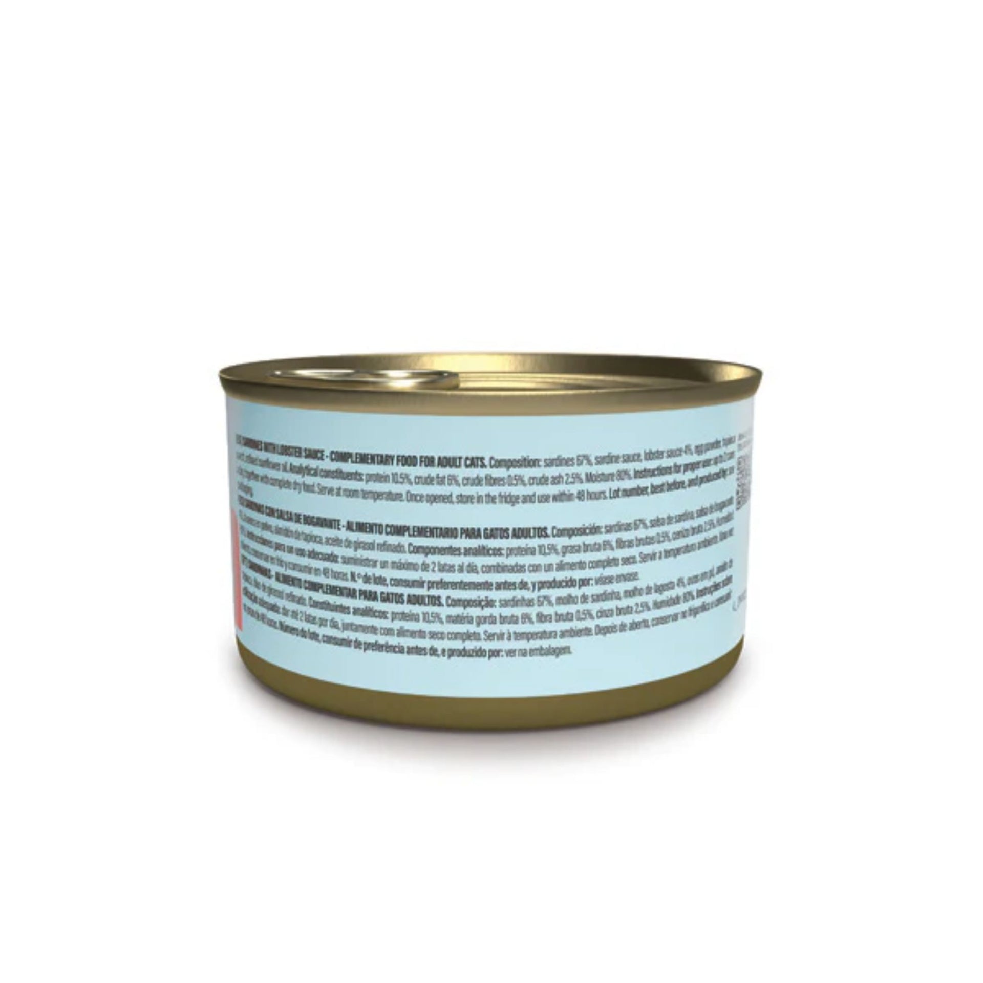 Sardines (min. 45%), lobster extract (2.5%), rice (1.4%), fish broth, sunflower oil, natural thickening agents, vitamins, minerals, taurine.