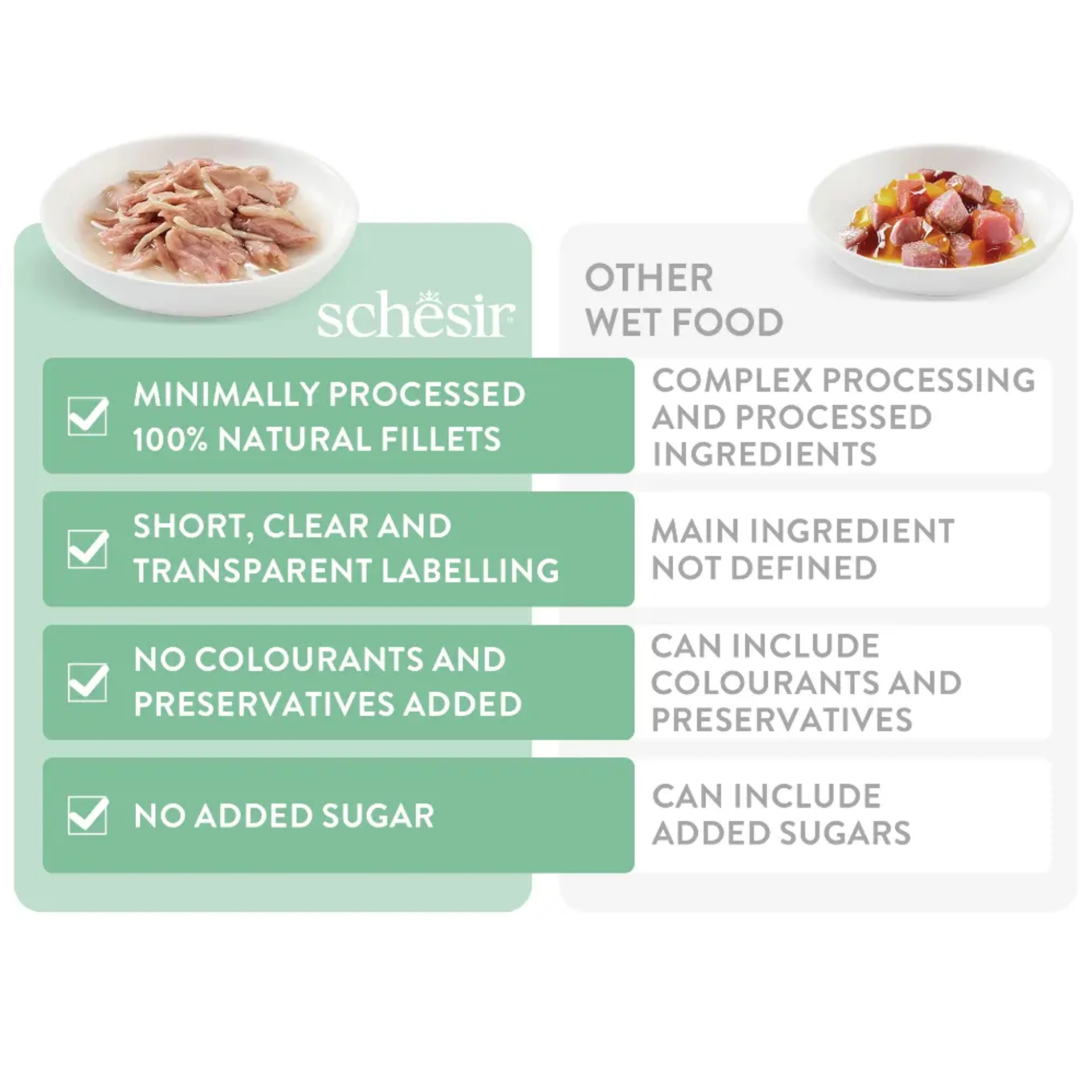 Schesir Tuna in Jelly provides complete daily nutrition with simple, natural ingredients. Each pouch contains tender tuna fillets, lightly steamed and preserved in a soft jelly that helps support hydration. Developed to meet the dietary needs of adult cats, this recipe is free from artificial colours, flavour enhancers, or preservatives.