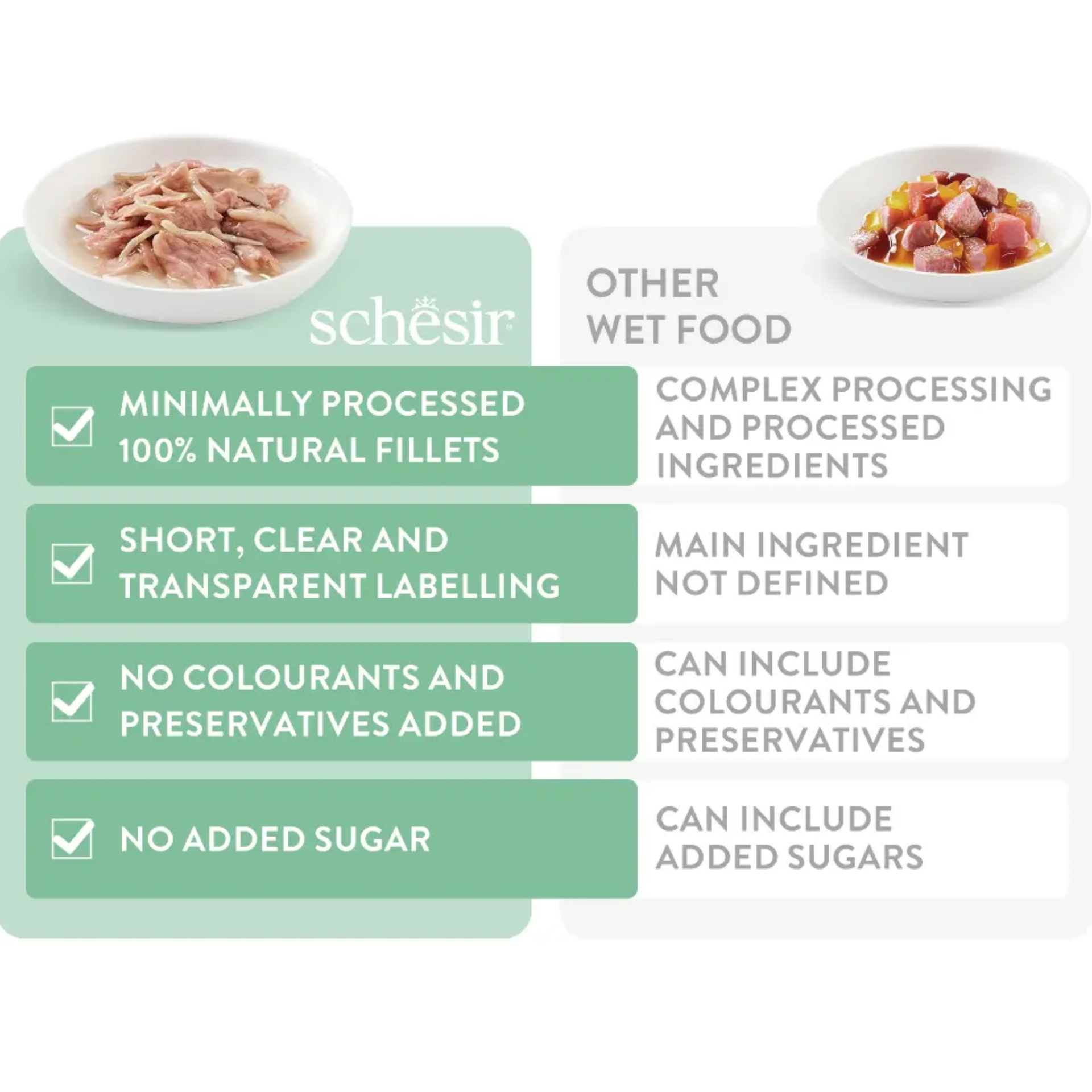 Give your cat a complete and satisfying meal with Schesir Tuna with Salmon Fillet in Jelly. This premium recipe features 100% natural fillets of tuna and salmon, combined with added vitamins and minerals to support overall health. The tender pieces are gently cooked and served in a soft jelly for maximum taste and hydration.
