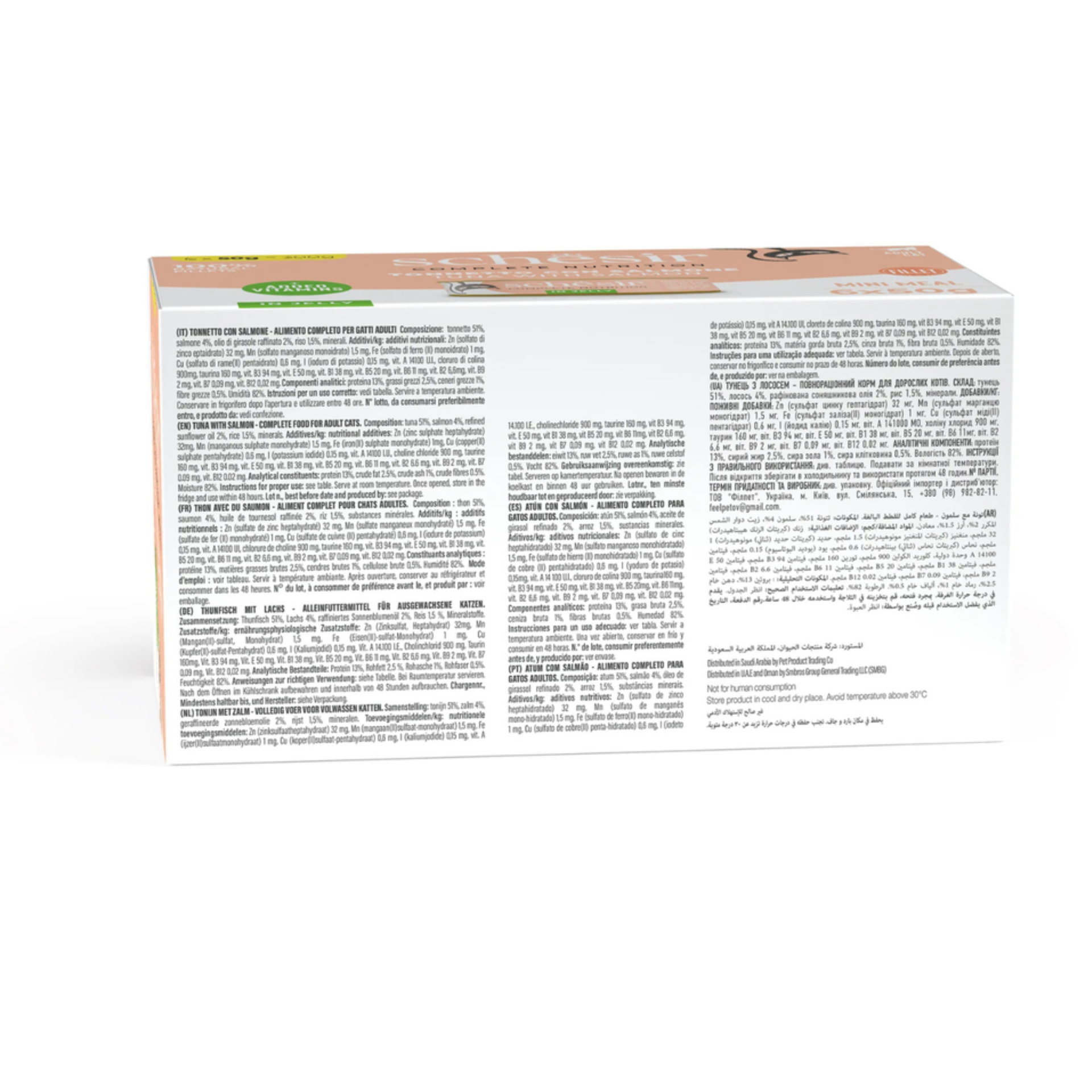 Tuna (min. 45%), salmon (min. 6%), rice (1.4%), jelly (vegetable origin), sunflower oil, vitamins, minerals, taurine.