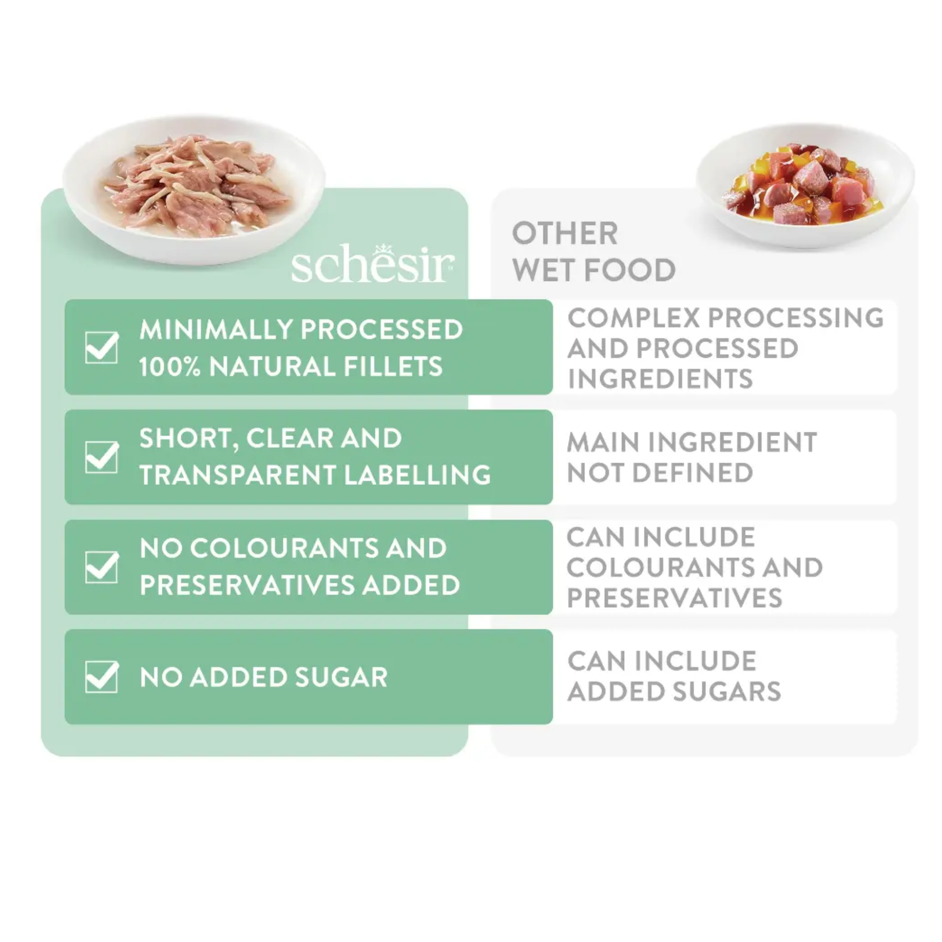 Schesir Tuna with Salmon in Jelly offers complete and balanced nutrition in a gently cooked wet food your cat will crave. Made with real tuna and salmon fillets, each portion is served in a delicate jelly that enhances flavour and texture while supporting hydration. This multipack is ideal for daily feeding, with clean, natural ingredients and no added artificial additives.