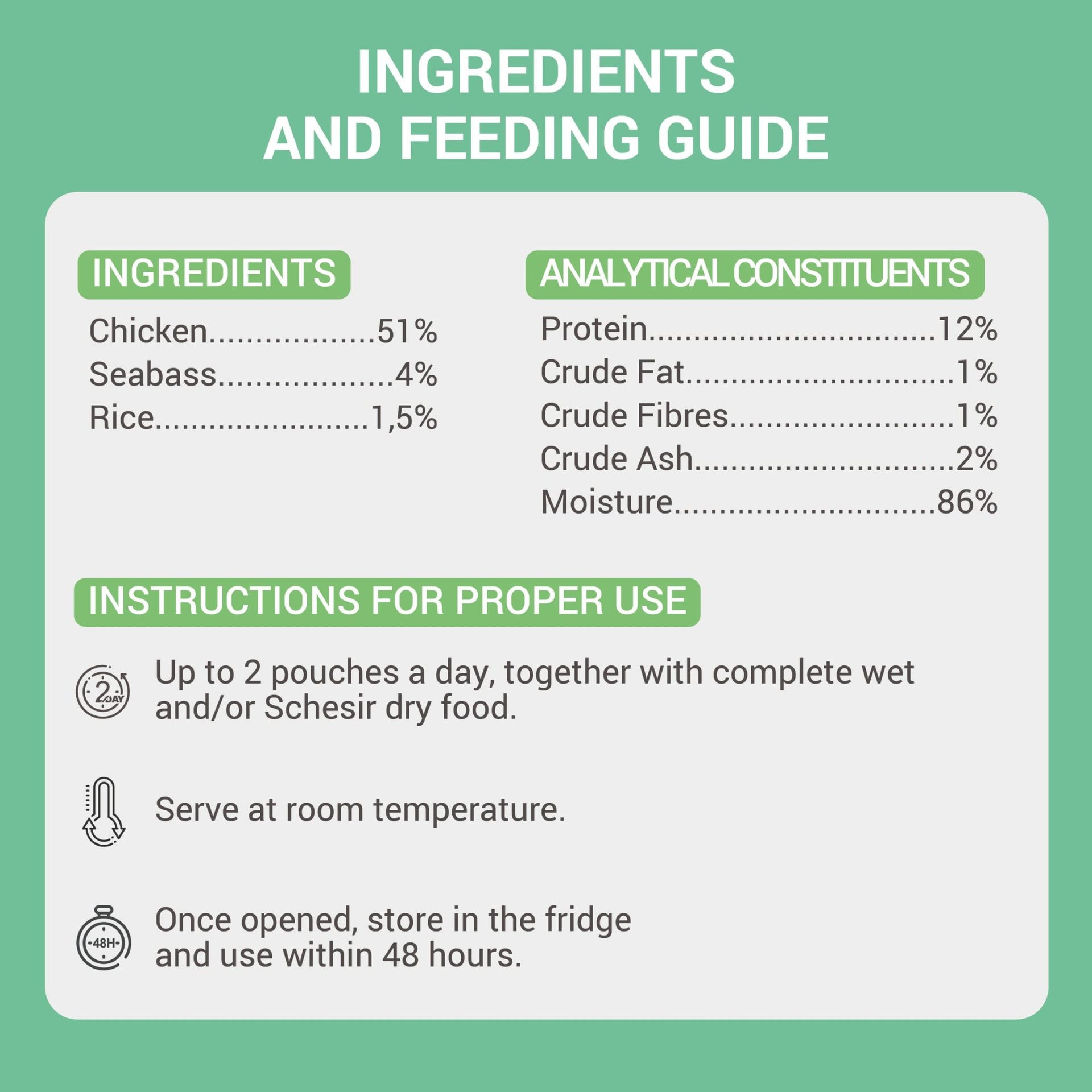 - Contains premium chicken fillets and real seabass
