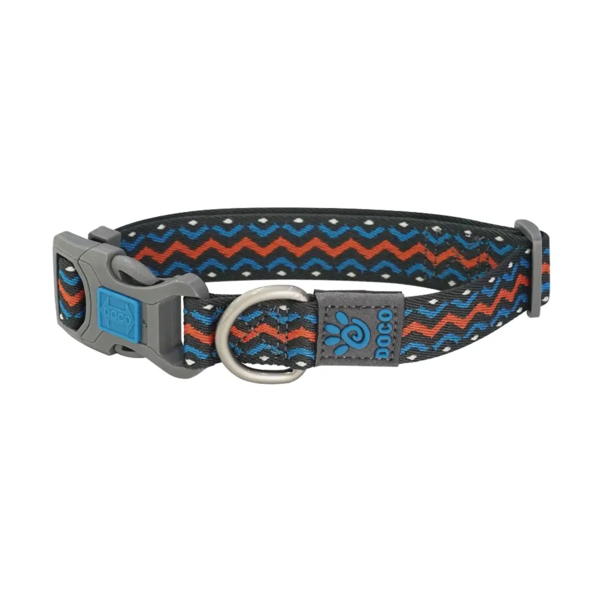 Doco Jacquard Weave Dog Collar D5 is designed for durability comfort and everyday style. The jacquard woven pattern provides a refined look while the strong construction ensures reliable use during daily walks. Its adjustable fit offers comfort and control for medium sized dogs.