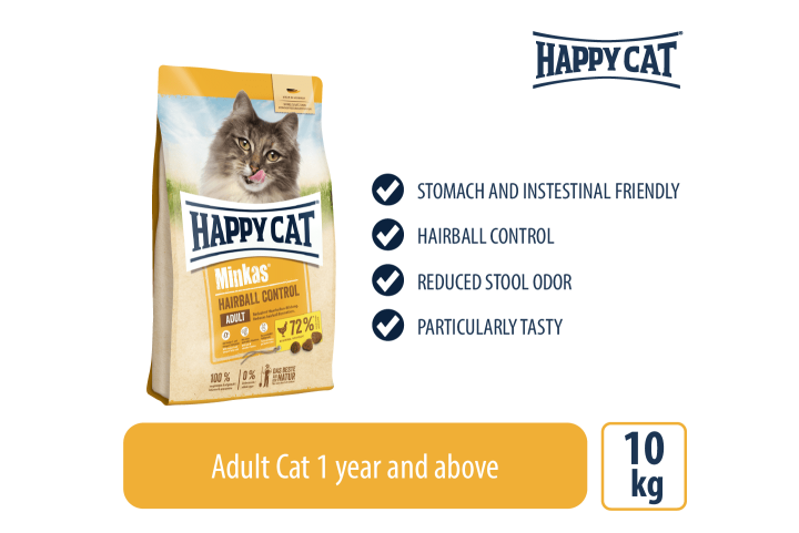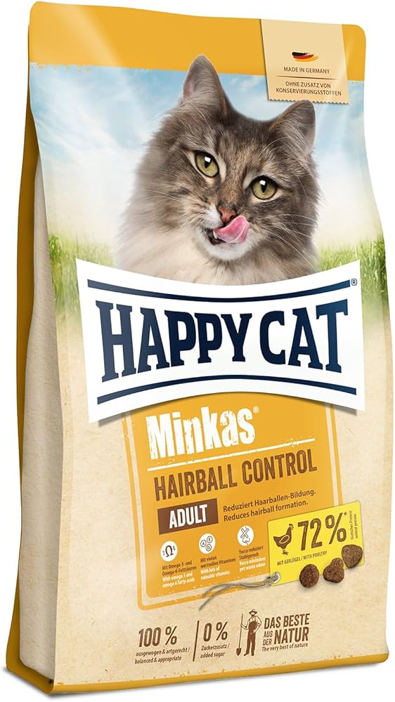 Specially developed for adult cats prone to hairball formation, Happy Cat Minkas Hairball Control supports natural digestion and reduces the build-up of hairballs. This wheat-free formula includes natural plant fibers that help move swallowed hair through the digestive tract, preventing it from accumulating in the stomach.